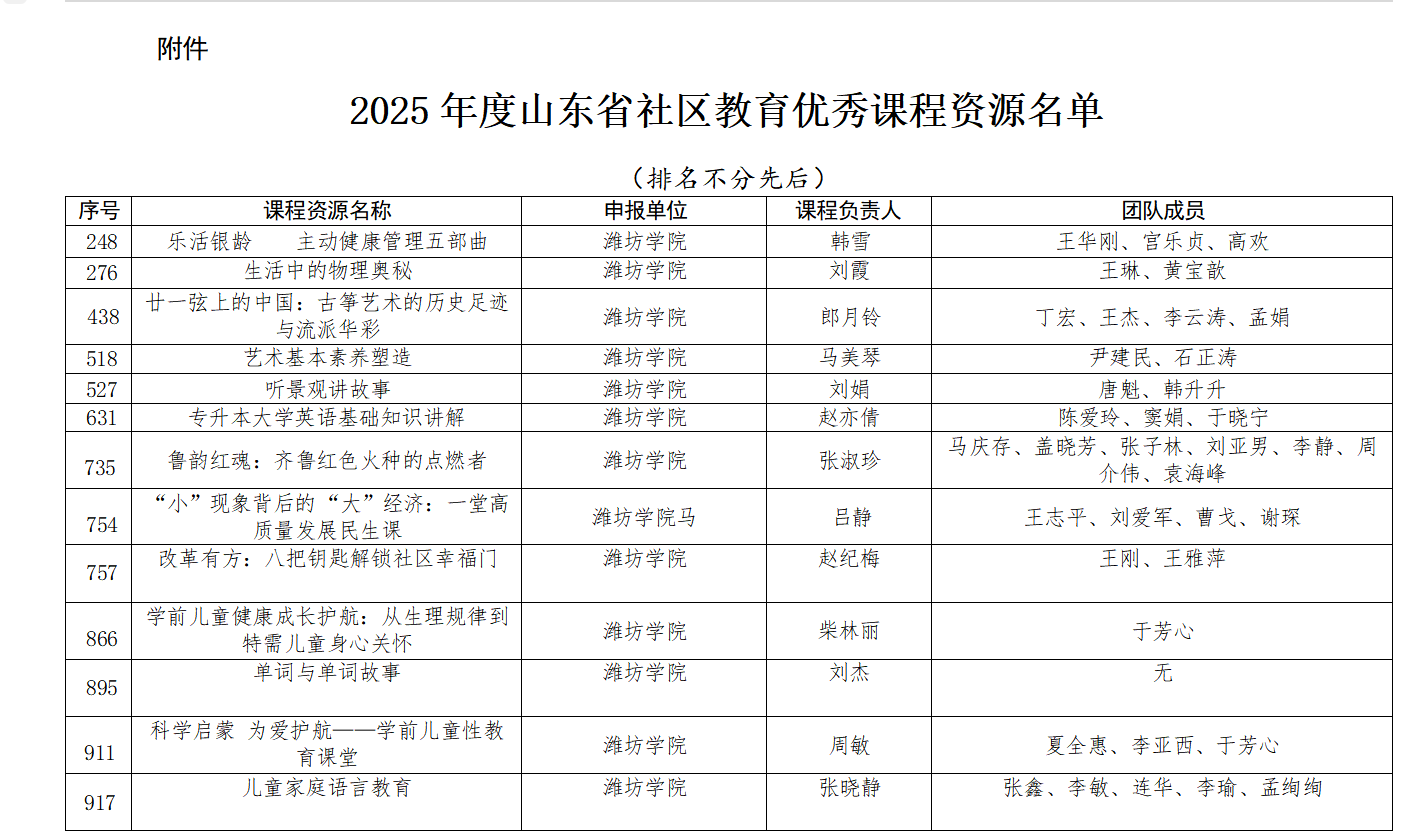 本网讯 近日,山东省教育厅先后印发《关于公布2025年度继续教育数字化共享课程遴选结果的通知》(鲁教民函〔2025〕15号)《关于公布2025年度社区教育优秀课程资源遴选结果的通知》(鲁教民函〔2025〕16号),山东省继续教育工程协会发布《关于公布2025年度山东省专业技术人员继续教育优质在线公需课评选结果的公告》。我校申报课程斩获佳绩,共18门课程入选,其中4门课程入选山东省2025年度继续教育数字化共享课程,13门课程入选山东省2025年度社区教育优秀课程资源,1门课程入选山东省2025年度专业技术人员继续教育优质在线公需课。