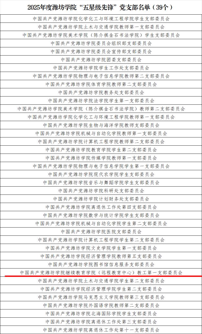 近日,中共潍坊市委教育工委印发《关于命名“五星级先锋”党支部的通报》,继续教育学院(远程教育中心)教工第一党支部成功入选,获评2025年度“五星级先锋”党支部。